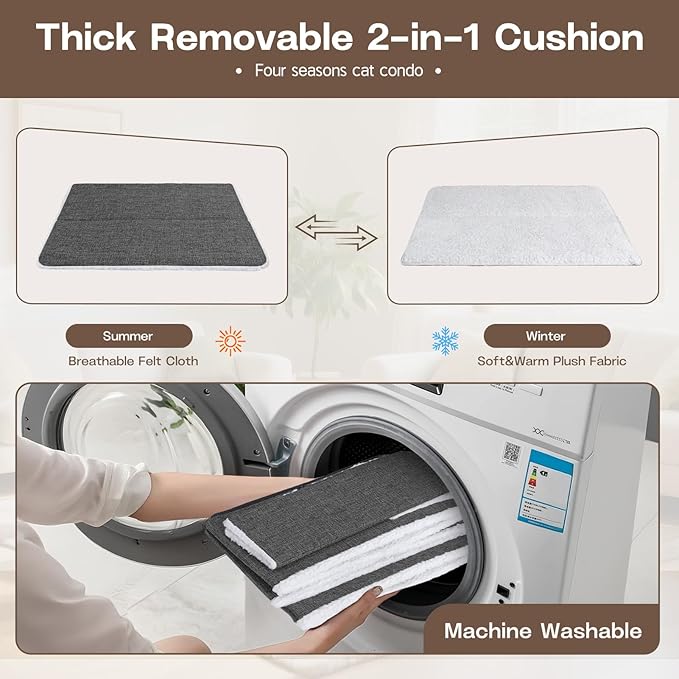 - Reversible Cushion for All Season: This indoor cat bed comes with two reversible cushions. One side is made of soft velvet, providing a warm home for your cat during winter. The other side uses linen fabric, making it comfortable and cool for use during hot summer days.