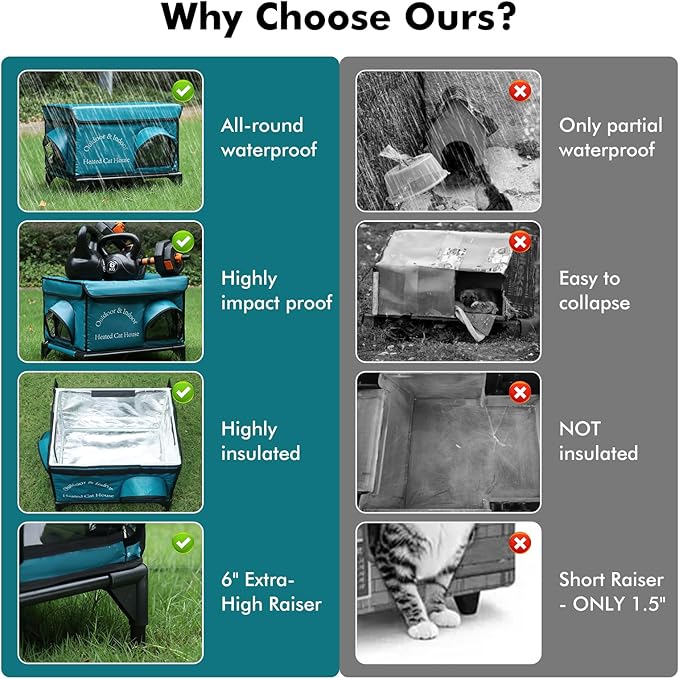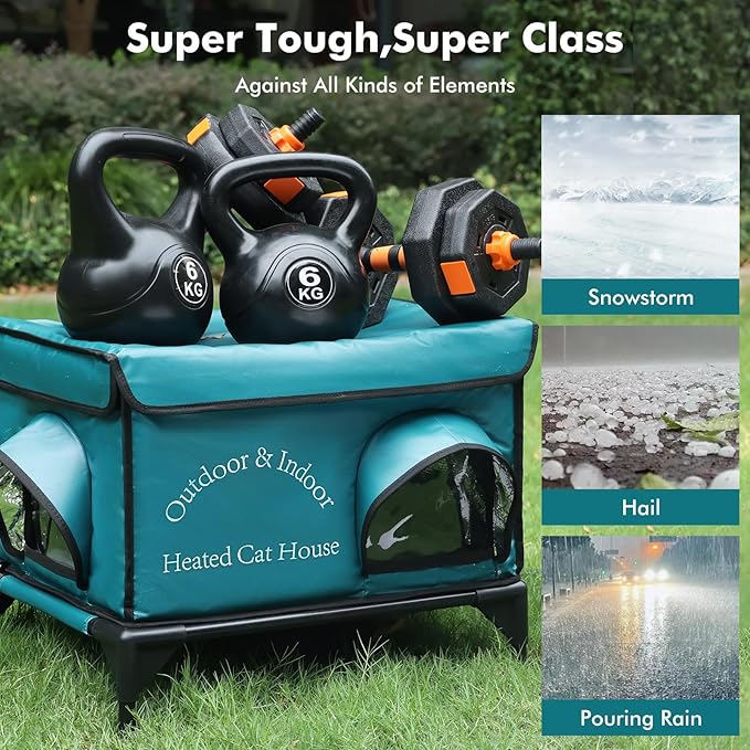 - Safety and Durability: Built with safety in mind, our cat house features sturdy construction that resists collapse and wear. The heating pad is designed to be safe for pets, includes chew-resistant cords, an Overheat protector and a low-voltage heating system, providing peace of mind for you and a secure, warm shelter for your cat