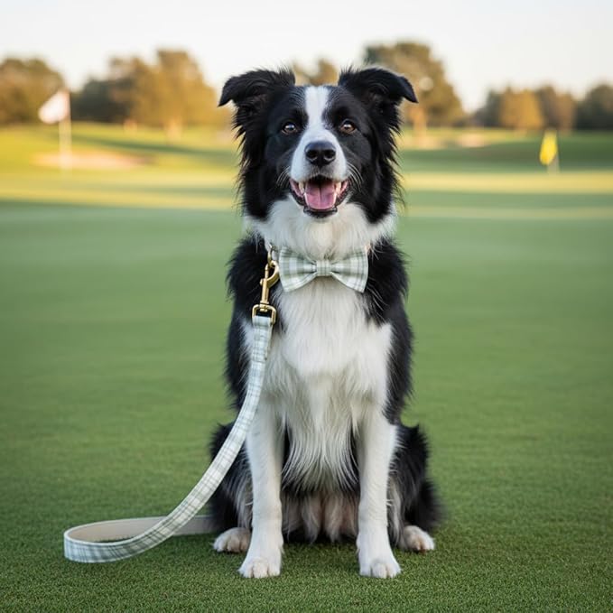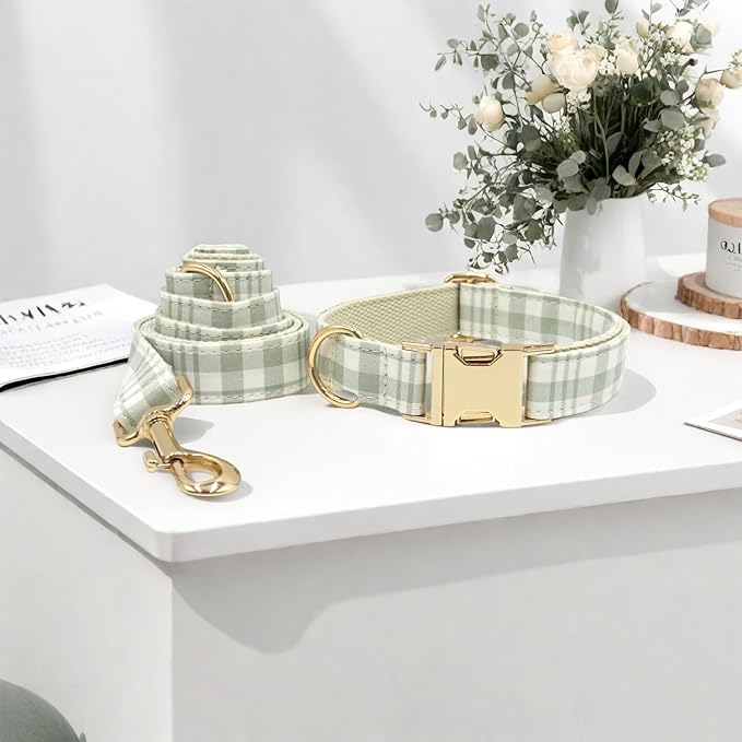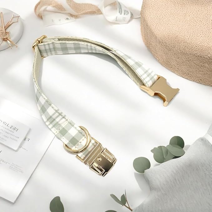 PETDURO Personalized Dog Collar Sage Green Plaid for Large Medium Dogs | Engraved Name and Phone Number on Gold Metal Buckle for Boys & Girls | Add Leash & Bow Tie via Customize Now