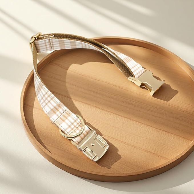 - Custom Engraved for Safety & Style: Keep your pet safe & cool! Our PETDURO personalized brown plaid dog collar features a rust-proof gold metal buckle custom-engraved by laser with their name & phone number. Say goodbye to jingling tags.