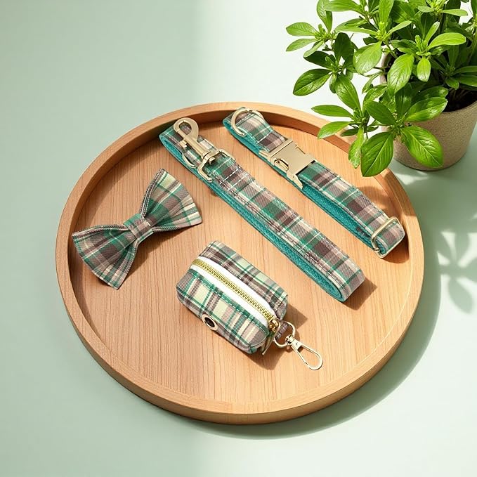 PETDURO Personalized Dog Collar Teal Brown Plaid for Large Medium Dogs | Engraved Name and Phone Number on Gold Metal Buckle for Boys & Girls | Add Leash & Bow Tie via Customize Now