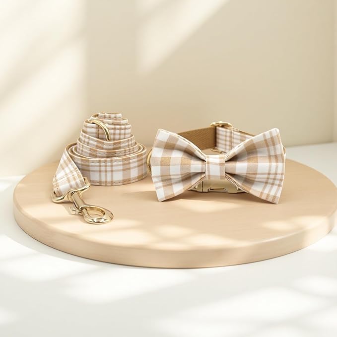 PETDURO Personalized Dog Collar Brown Plaid for Large Medium Dogs | Engraved Name and Phone Number on Gold Metal Buckle for Boys & Girls | Add Leash & Bow Tie via Customize Now