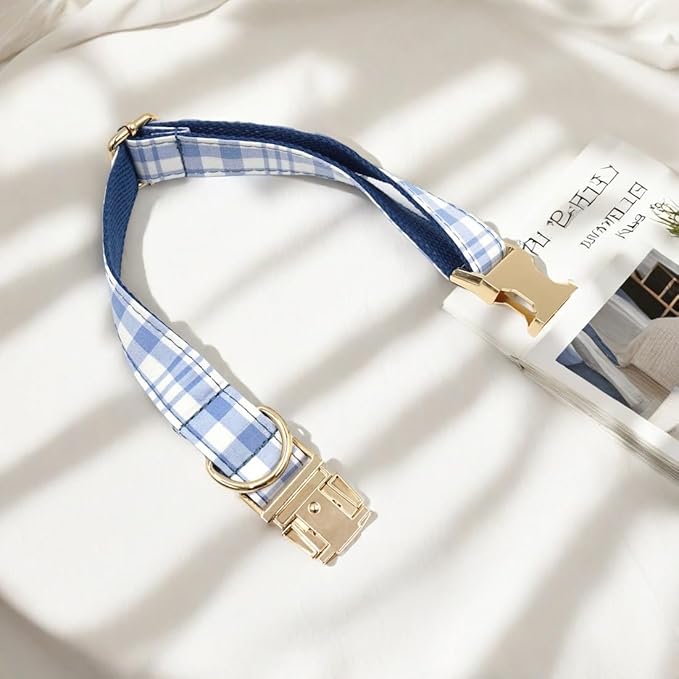 - Custom Engraved for Safety & Style: Keep your boy safe & cool! Our PETDURO personalized navy blue plaid dog collar features a rust-proof gold metal buckle custom-engraved by laser with his name & phone number. Say goodbye to jingling tags.
