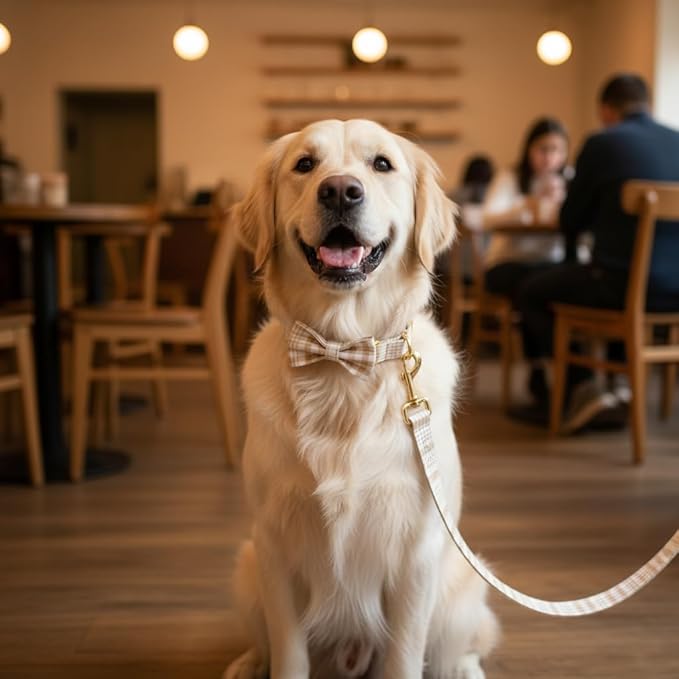 PETDURO Personalized Dog Collar Light Brown Plaid for Large Medium Dogs | Engraved Name and Phone Number on Gold Metal Buckle for Boys & Girls | Add Leash & Bow Tie via Customize Now