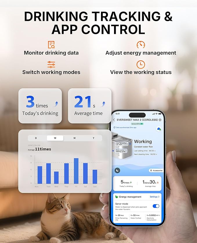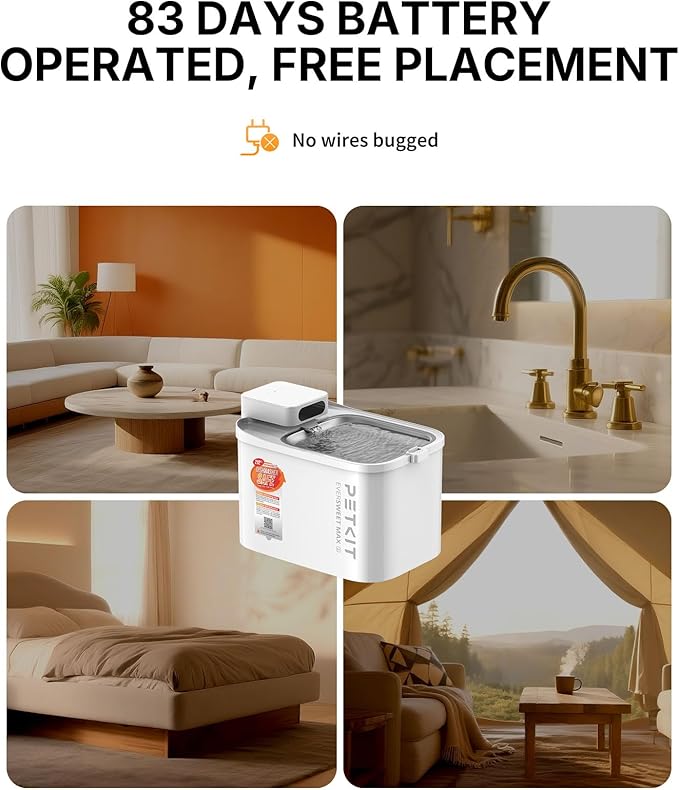 - Wireless Cat Drinking Fountain: PETKIT upgraded Eversweet max 2 cordless cat water dispenser, no need to plug in, you can place it anywhere: kitchen, bedroom, balcony, etc., bring you a new feeling; 5000mAh high-capacity battery, service life up to 83 days! No more worry about your cat or dog running out of water during power outages or short trips! When the fountain is short of water, the pump will automatically stop working to prevent the device from burning out.