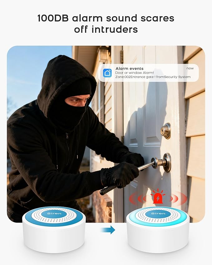 - Instant Alerts & Loud Siren: When someone breaks into your home, an alarm will sound immediately and send real-time alerts directly to your phone.