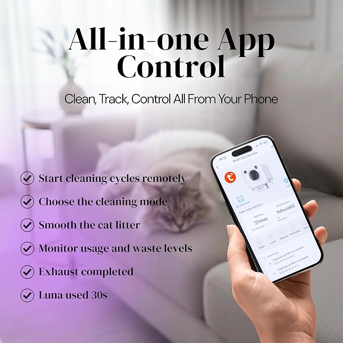 - 【APP CONTROL & CAT HABITS MONITORING】Control your litter box remotely via Tuya app (compatible with 5G and 2.4G Wi-Fi networks). Track litter activity, monitor cat health, and receive real-time notifications.