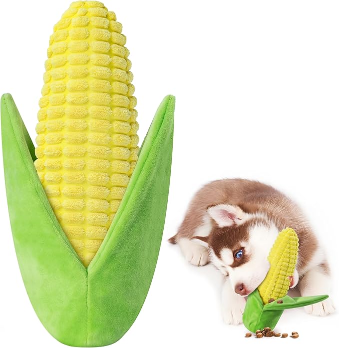 - Squeaky Dog Toys - Attract your dogs’attention by vivid colors and cute corn-shaped stuffed dog toy, when pets play will make fun sounds. It has two sounds inside, funny squeaker and crinkly paper, incredibly inspire dogs curious and add more excitement, keep your dogs entertained for days, provide healthy playtime. puppy chew toys with squeakers satisfy pups hunting instincts, IQ stimulates and mentally guide