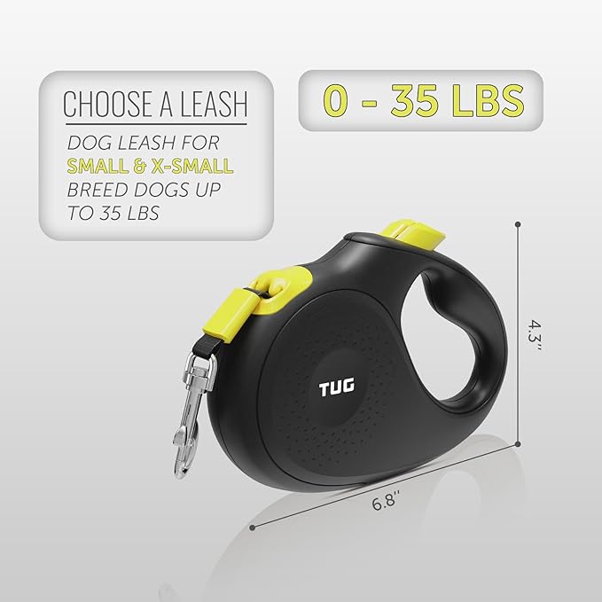 TUG 360° Tangle-Free Retractable Dog Leash | 16 ft Strong Nylon Tape (Small, Black/Yellow)