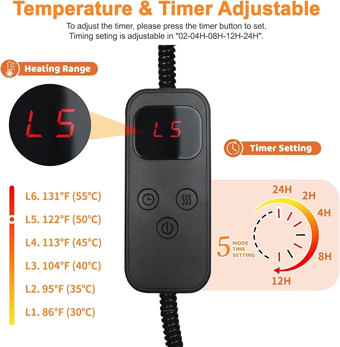 - Intelligent Temperature Control and Timing: The cat warming pad supports 6 temperature settings (86°F–131°F / 30°C–55°C) and 5 timer settings (2, 4, 8, 12, or 24 hours). Equipped with a controller and temperature sensor, it provides real-time and precise temperature control. Automatically shuts off at the set time to prevent overheating and protect your pet's safety.