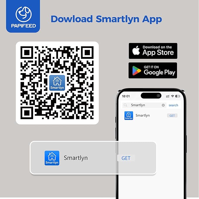 - 【Smart WiFi Feeding & Slow Feed Mode】Schedule 10 meals/day (up to 12 portions each) via "Smartlyn" App, with real-time manual feeding. New Slow Feeder mode gently dispenses food per minute to prevent bloating and aid digestion. Monitor meals remotely—ideal for travel or long workdays. Feeding records automatically sync to the cloud. Compatible with 2.4GHz WiFi networks for reliable connectivity.