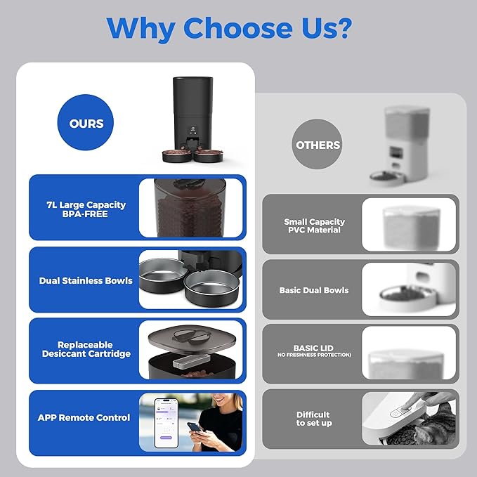 - 【7L Large Capacity & Detachable Bowls】Holds up to 29 cups/7L of food—enough to last weeks. Features removable stainless steel bowls that are dishwasher-safe. The automatic feeder for two-cat homes or long weekends away.