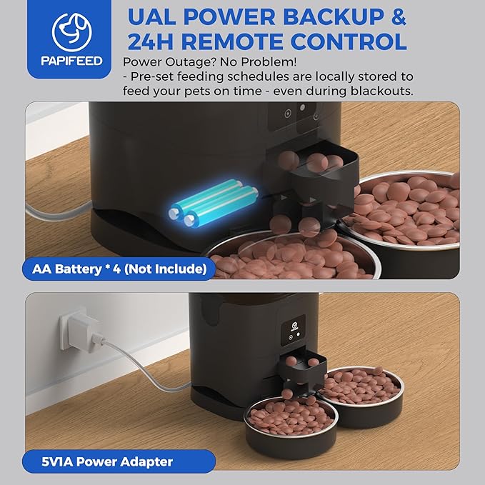 - 【Dual Power Supply】This feeder supports both adapter and battery backup (batteries not included). Worried about power outages? No problem—even on battery mode, it allows full APP remote control to ensure your pet never misses a meal. Tip: For daily use, keep the adapter connected; batteries serve as emergency backup only.