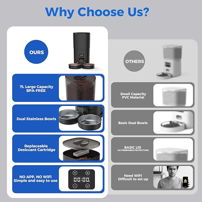 - 【7L Dual-Pet Capacity】7L large capacity dog/cat feeder automatic-style storage (~29 cups). Feeds two 8.8-11lb pets for 2 weeks - the ultimate automatic feeder for two cats solution.