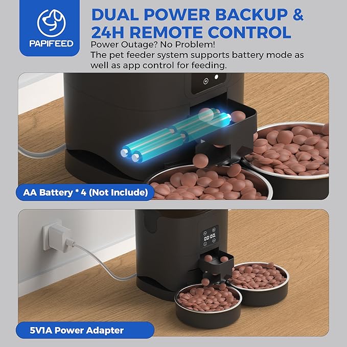 - 【Dual-Circuit Power Backup】5V1A adapter + 4 AA batteries (auto-switch during outages). Ensures zero feeding interruptions - your dual cat feeder automatic works through storms/power failures.