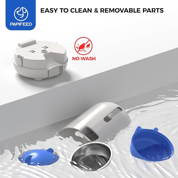 - 【SPLIT AND EASY-TO-CLEAN DESIGN TO PROTECT YOUR PET’S HEALTH】The PAPIFEED cat food automatic feeder adopts a split design. The grain bin and grain outlet channel can be completely disassembled and can be directly rinsed with clean water, completely eliminating sanitary dead corners and effectively preventing bacteria from growing. Its simple and sturdy mechanical structure ensures that the feeder can operate stably and for a long time, providing continuous and reliable food guarantee for your pet.