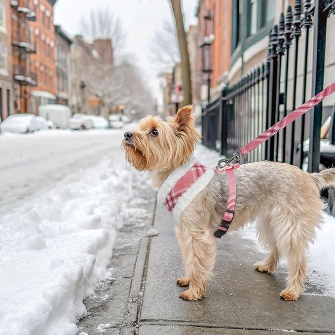 - DOG CHRISTMAS HARNESS: Featuring a classic plaid pattern with new fashion elements, you don't have to worry about being outdated. Pink plaid with white fleece inside, and suitable for your dog and dress up at Christmas, suitable for most dog and cat breeds and coat colors, make the dog look full of youthful vitality