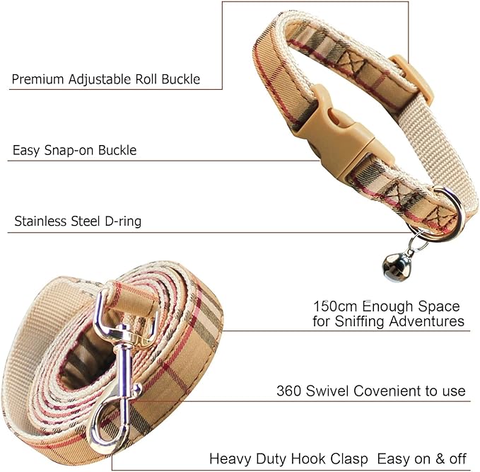 Cute Plaid Dog Collar Harness and Leash with Safety Buckle - Adjustable and No Pull Comfortable Dog Collars for Small Puppy, Stylish Durable Gift for Boy Girl Pets