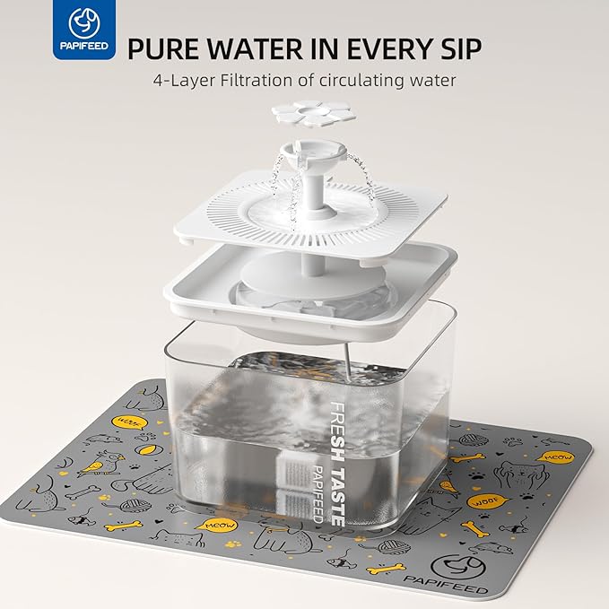 - 3L Water Fountain with Triple Filtration — Clean, Fresh Water for Better Hydration: The included water dispenser features a 3L capacity and a triple-filtration system that removes debris, impurities, and odors for consistently fresh water. The upgraded low-noise pump keeps the water flowing gently to encourage drinking. Its recessed design helps maintain water availability even during short power interruptions, supporting your pet’s daily hydration needs.