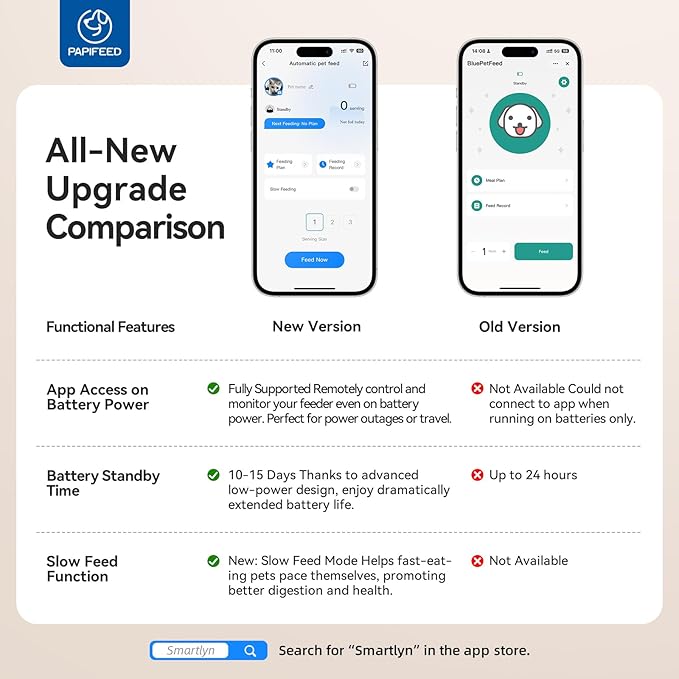 - Smart APP Control via 2.4GHz WiFi — Build a Precise Feeding Plan: Connect the cat food dispenser using Bluetooth and 2.4GHz WiFi (Not support 5G), then manage everything through the “Smartlyn” APP. Create up to 12 meals per day, each offering 1–10 portions (≈ 0.35 oz per portion) to meet your pet’s dietary needs. Easily edit schedules, monitor feeding records, and adjust meal sizes remotely to maintain a healthy eating routine.