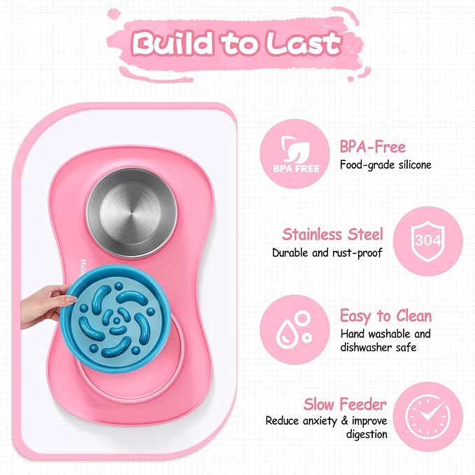 MateeyLife Dog Food Bowl Set 3 in 1, Dog Bowls & Water Stainless Steel Bowl with Non-Spill Silicone Mat, Slow Feeder Bowls for Small, Medium, Large Breeds, Cat Feeding Dish to Anti-Choking