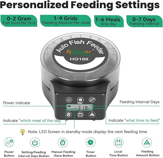 - A Reliable Assistant For Fish Owner: hygger automatic fish feeder can feed fish at fixed times, in fixed quantities and at fixed points, allowing you to enjoy your vacation, handle work or rest without worrying about your fish going hungry