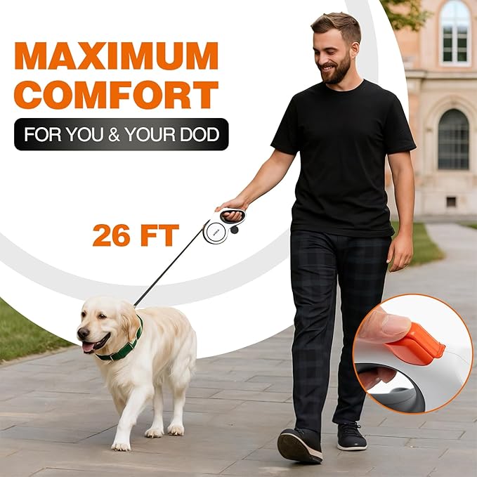 - UPGRADED 26FT RETRACTABLE DOG LEASH: Offering 5x more length than standard leashes, our extra-long leash gives your dog ample freedom to explore open fields or spacious parks while maintaining secure control. Perfect for active pups who love to roam!