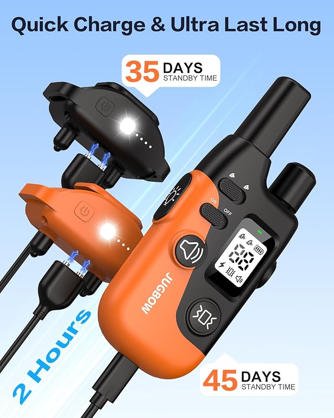 - [Incredible Battery Life & Quick Charging] Charging via USB, 2-in-1 fast charging only 2 hours to be fully charged. This dog training collar with remote provides battery life that lasts for a long time, the e collar can last up to 35 days of standby time and the remote 45 days!