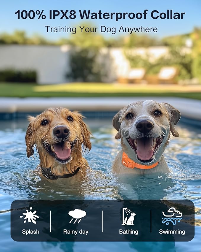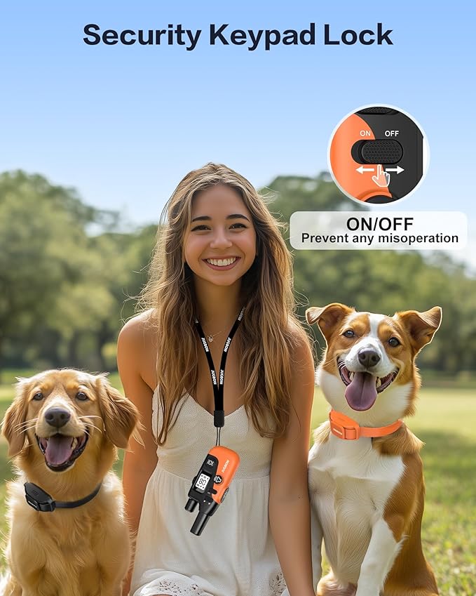 - [IPX8 Waterproof Collar & Security Lock] The electric dog collar is IPX8 waterproof design, making it suitable for use in all weather conditions, Allows you to train your dog while he swims. The remote features a safety lock and switch button, it ensures quick response, preventing accidental activation.