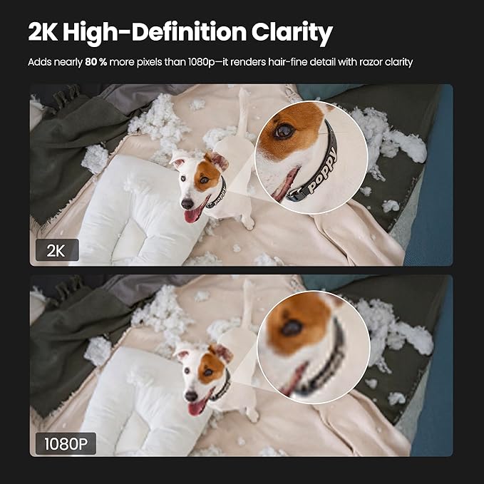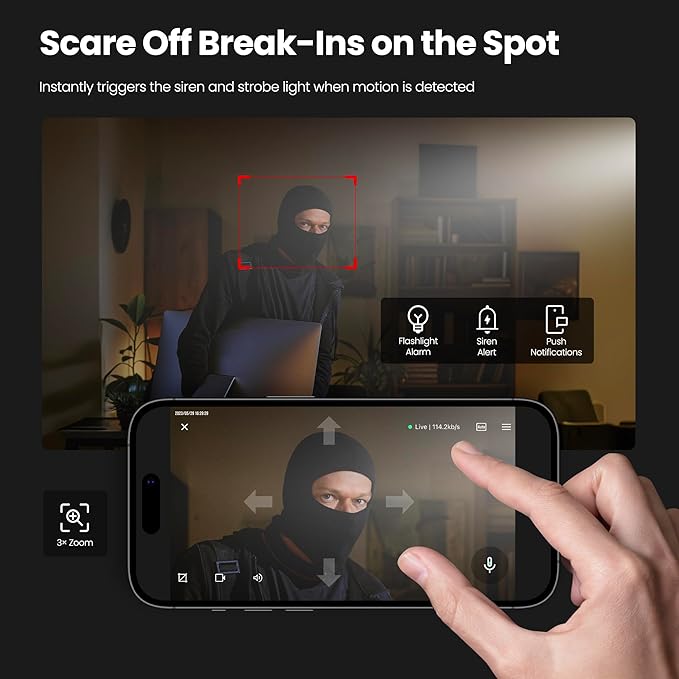• 2K Resolution & Color Night Vision: The wired indoor camera delivers 2K crystal-clear video with sharp details and supports 3X digital zoom to enlarge suspicious areas and capture important details. Full-color night vision captures vivid images up to 33 ft, even in total darkness or low light.