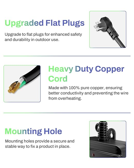 - [WEATHERPROOF & SAFE HEAVY DUTY DESIGN] Built with IP44 waterproof protection to withstand rain, snow, and outdoor conditions. ETL listed with 1875W/15A rating and a 6.8-inch cord for flexible placement.