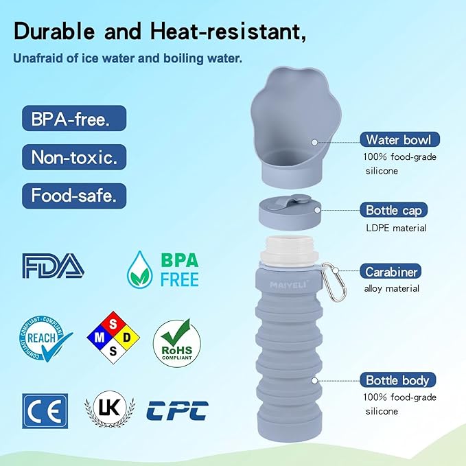 - Collapsible & Portable: This collapsible dog water bottle is designed for convenience, allowing you to easily fold and carry it in your bag. Ideal for dog walking, hiking, and travel.