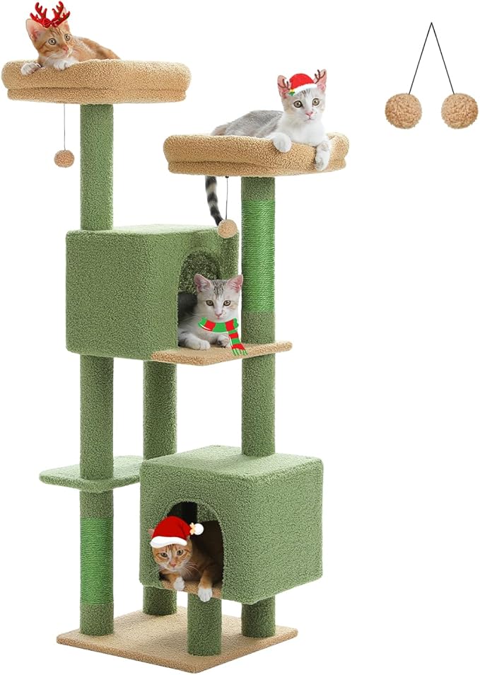 Cactus Cat Tree, 52.4 Inch Multi-Level Cat Tower for Indoor Cats with Dual Padded Top Perches, 2 Condos & Scratching Posts, Plush Cat Furniture for Kittens and Medium Cats, Green