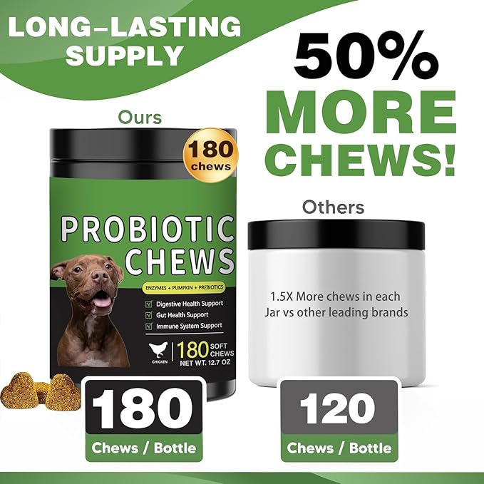 - 【Value Pack for Lasting Probiotics Support】-- Each jar contains 180 dog gut health probiotics chews, offering a 2-3 month supply based on your dog's size and needs. Our soft probiotic treats in delectable chicken flavor cater to all breeds, sizes, and ages. Ideal for continuous use, these probiotic chews help elevate your pet's wellness & help them stay in top shape.