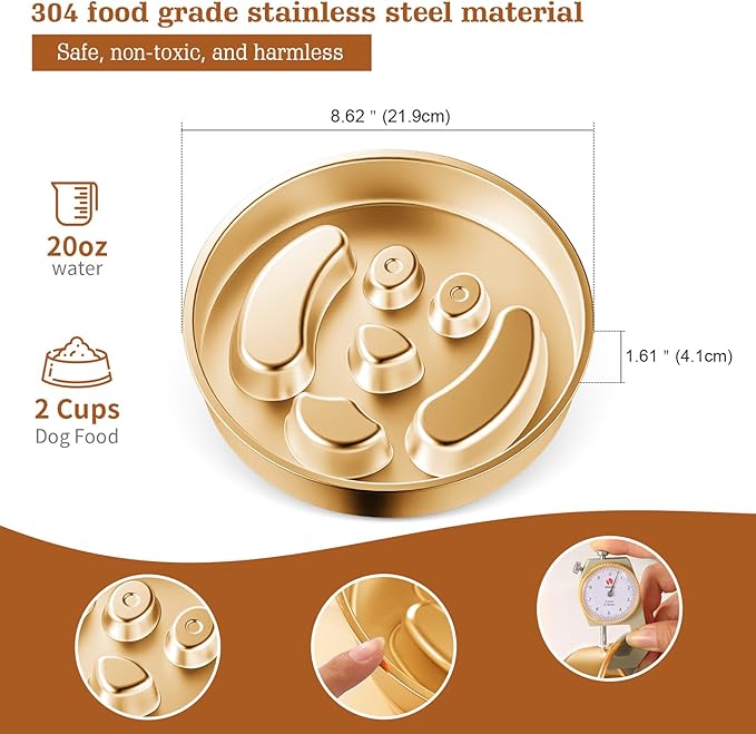 Golden Stainless Steel Slow Feeder Dog Bowls – Non-Slip Metal Dog Bowl for Large & Medium Breeds, Puppy Puzzle Feeder – 2 Cup Capacity for Small to Big Pets – Durable Slow Feed Dog & Cat Food Dish
