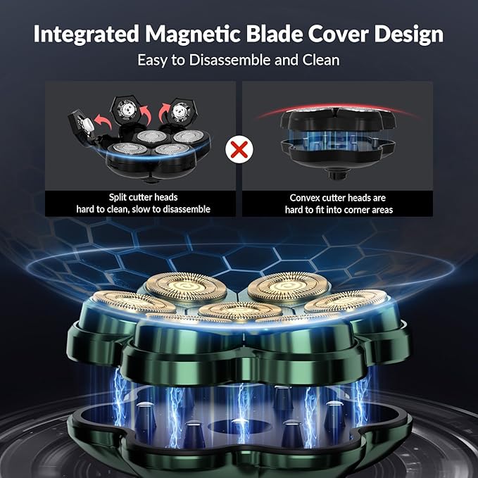 - Multi-functional Shaver Specifically Designed for Men: Upgraded 7D concave blade design fits head and face contours better. Whether it’s shaving your beard or going completely bald, this shaver has you covered. Integrated magnetic detachable head offers a professional floating shave for bald men. Easy to remove and rinse, perfect for men who value speed, cleanliness, and no-fuss maintenance