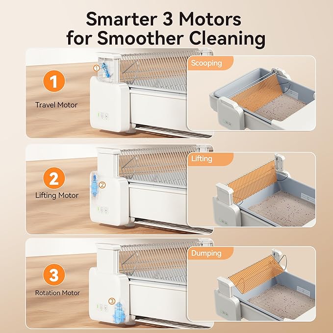- Enhanced and Smooth Self-Cleaning: Enjoy hassle-free cleaning with our upgraded automatic litter box! It has a powerful system with 3 types of motors—travel, rotate, and lift—that work together seamlessly. to collect waste, sift through the litter, and transfer everything to the waste bin. Say goodbye to scooping and hello to convenience