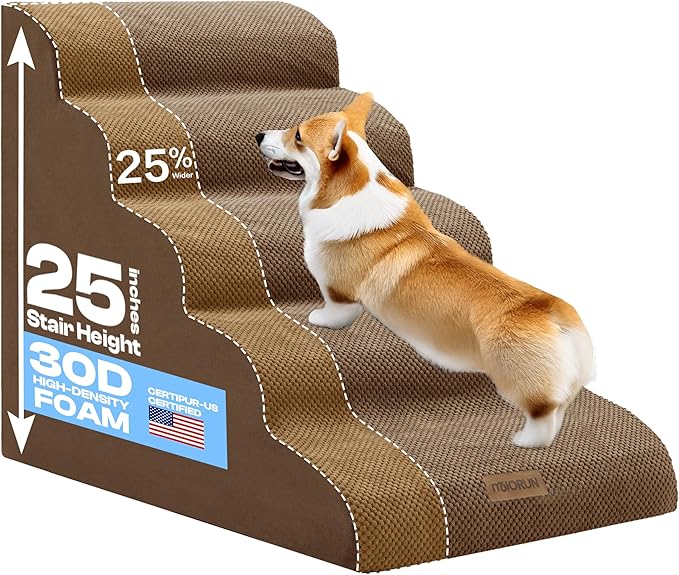 Extra Wide Dog Stairs for Large Dogs Up to 80lbs, 25" Pet Steps for High Bed with Washable Cover, 5-Step Foam Bed & Couch Ladder for Small Medium Dogs & Senior Cat, Coffee