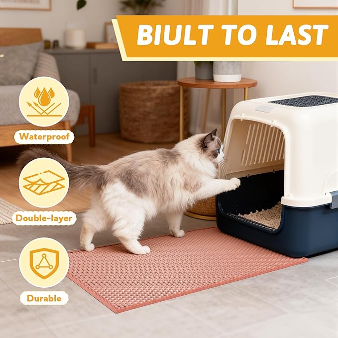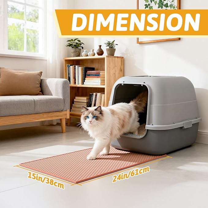 - Anti Tracking EZ Open Edge Litter Mat: Double-layer honeycomb design helps you gather the litter. You just pick up the mat and all the litter falls through and then dump it back in the litter box make it recycling. BEST MAT EVER! No more getting litter stuck to my feet on a daily basis! Large holes is large enough to catch and trap litter. Suitable for lots of type of litter, and kitty litter boxes,hooded,self cleaning litter box.