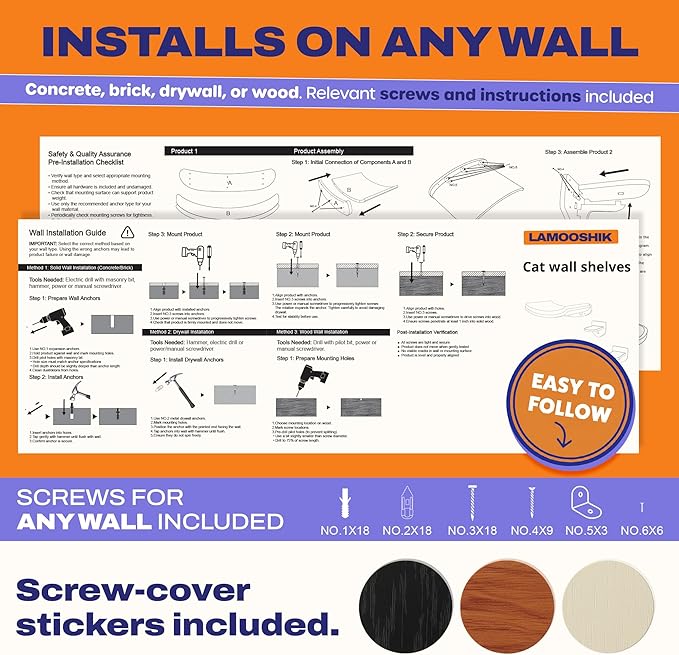 - Easy to Install: Designed for a smooth and simple setup, the installation kit fits multiple wall types including drywall, brick, wood and concrete. Clearly illustrated instructions make the process quick and safe so your cat can enjoy their new wall space with confidence.