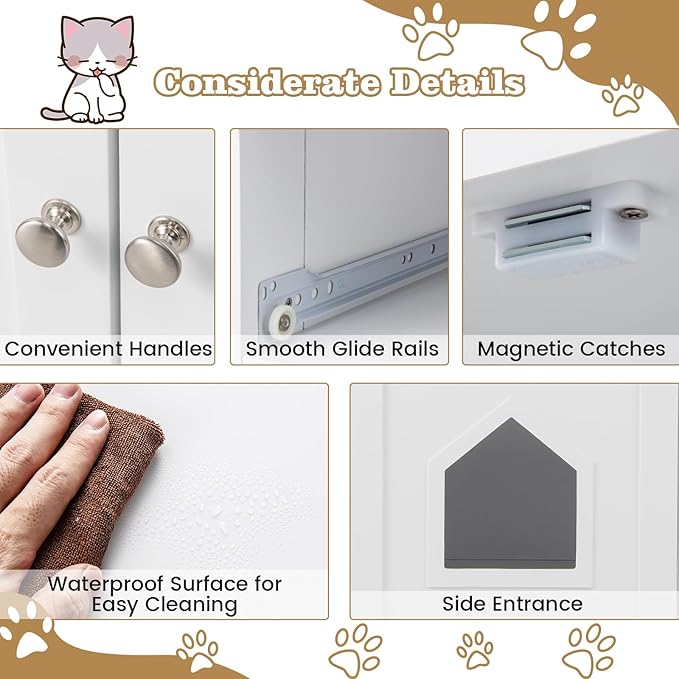 - Convenient Entrance & Upkeep: This cat house features a side entry that allows your cat to come and go without hassle. With double doors, the cat litter box enclosure provides easy access for cleaning and maintenance.