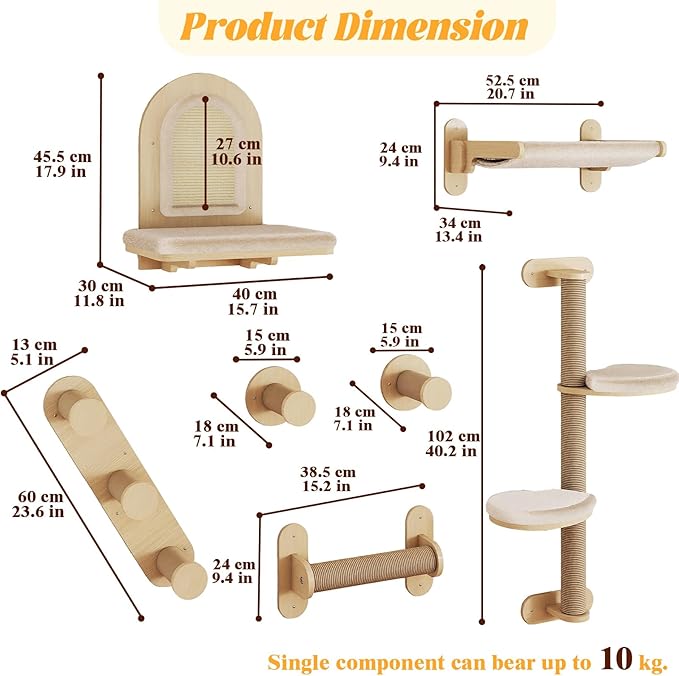 - EASY ASSEMBLY AND WALL INSTALLATION: Our wall-mounted cat tree comes with a detailed installation instruction. The assembly process is very simple. After assembly, you only need to use tools to nail the accessories to the wall. If you have any questions, please contact our store to solve the problem for you.
