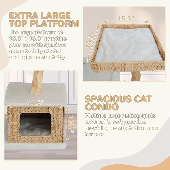 - 【Multi-Level Design】 The multi-level design is easy for cats to climb up and down. Caves let them relax and recharge in comfort. The unique tree trunk cat tree also offers tightly woven scratch posts. Cats can scratch and sharpen their claws on the sisal material, which also prevents them from scratching furniture. The ball with hanging helps inspire the cat's curiosity, giving them extra thrill and entertainment;
