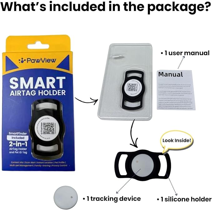 Smart Pet Tracker for Collar - Dog Trackers Location for Pet with Holder, No Monthly Fee, Real-Time Tracking, iOS Only, Emergency Contact, Long-Lasting, Anti-Lost Tracker for Cats, Bag Straps, Black