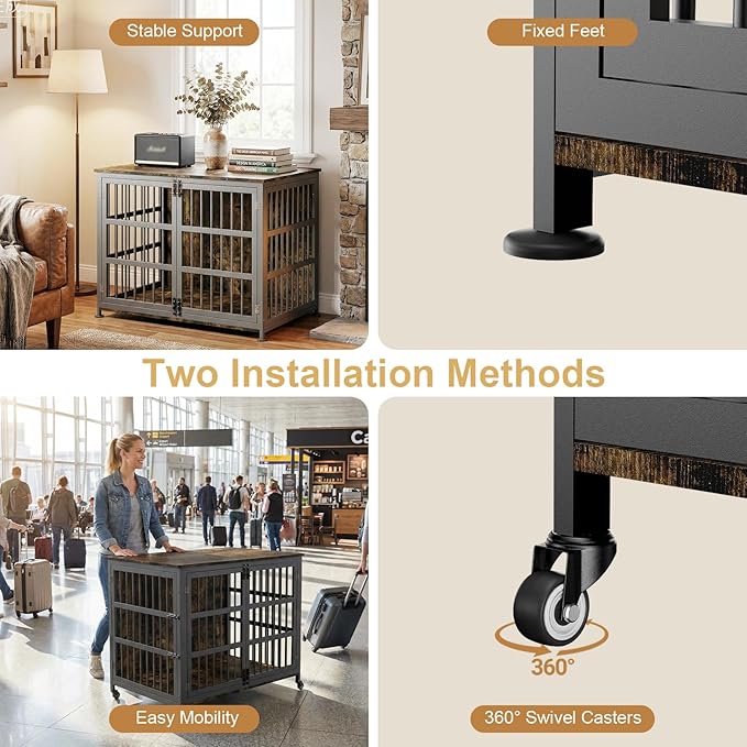 - With Wheels & Fixed Feet: This dog crate furniture lets you switch between stationary and mobile modes for versatile use. The wheels make moving the crate outdoors for cleaning effortless. Note: Wheels aren’t lockable—use only when mobility is needed