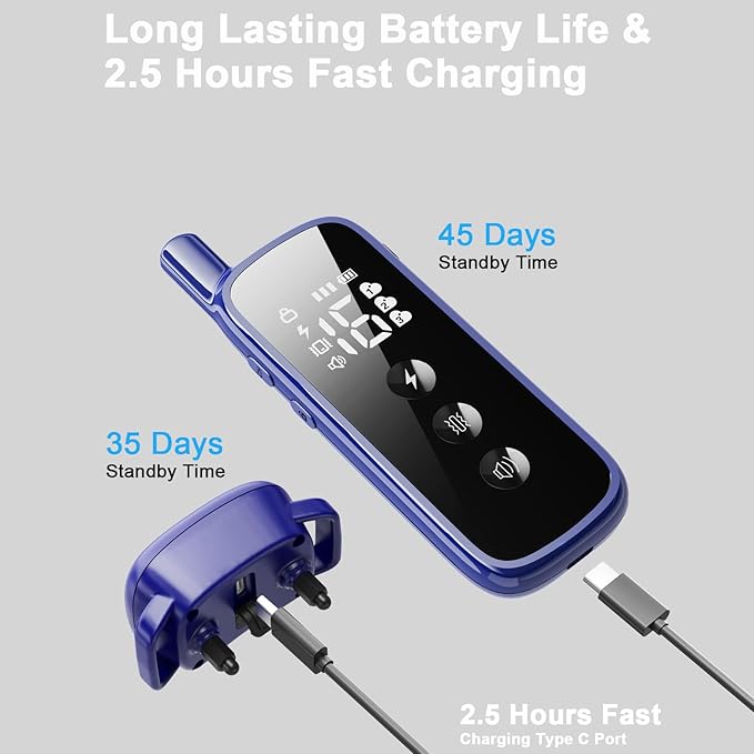 - Rechargeable Efficiency: aikko dog electric collar charges fully in 2.5 hours via USB Type-C.The receiver lasts up to 35 days, and the remote up to 45 days on standby, ensuring continuous training with quick recharges.
