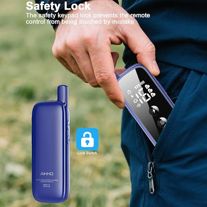 - 3 Training Modes: aikko dog trainig collar offers Beep, Vibration (1-16 levels), and Shock (1-16 levels) for stubborn dogs. The remote's ON/OFF key and security lock prevent accidents, ensuring humane correction and user-friendly operation,Enables you to set the correct stimulation level for your pet and correct bad behavior promptly.