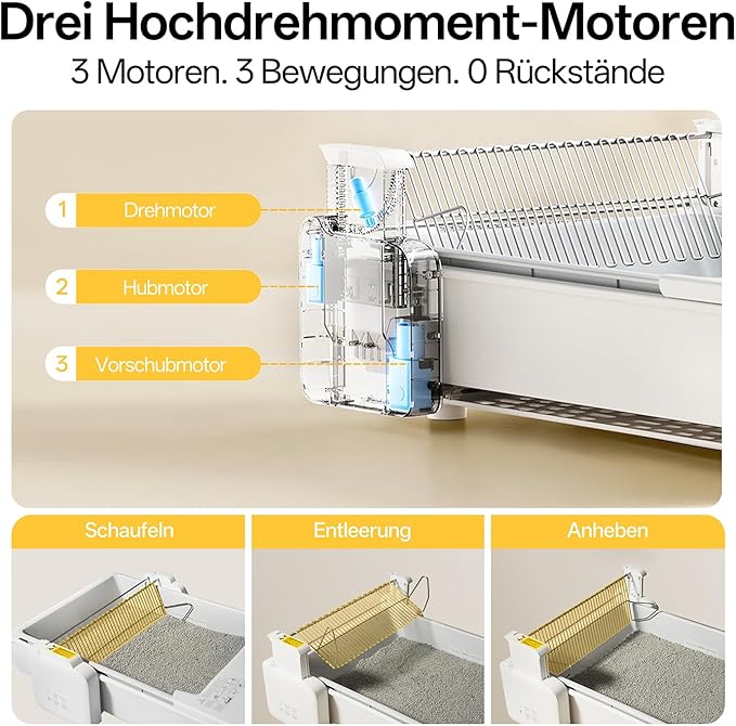 - 🐾 EFFICIENT, THOROUGH, HANDS-FREE CLEANING – Powered by 3 high-torque motors, the metal rakes perform horizontal, flipping, and lifting motions for complete, carpet-style waste removal. Our patented dual-rake design ensures no leftover residue: the main rake powerfully scoops clumps, while the secondary rake scrapes away residue for a thorough, residue-free clean every time.