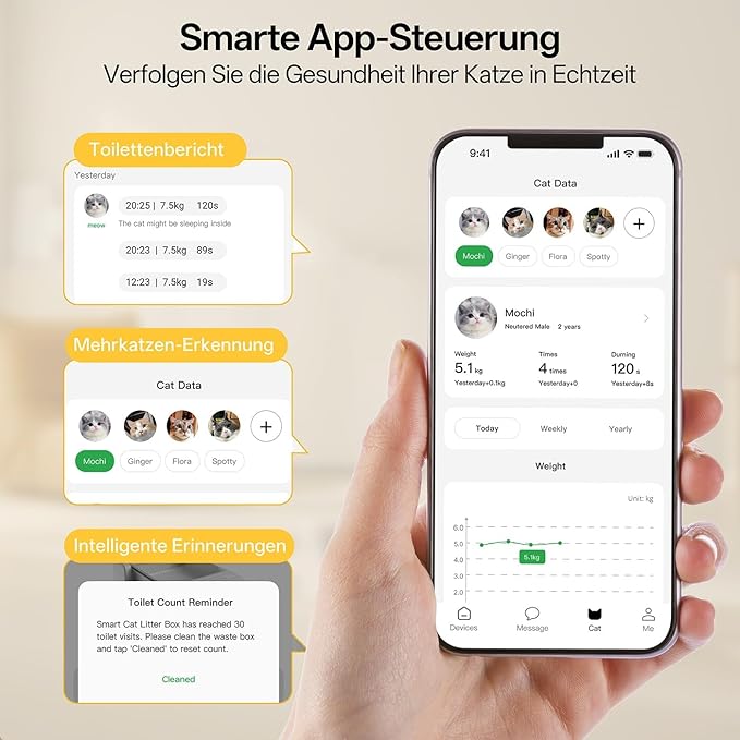 - 🐾 MULTI-CAT MANAGEMENT IN ONE APP – Remotely control and monitor the litter box from anywhere. It tracks essential health metrics for each cat—including bathroom frequency, duration, and weight changes—and generates synchronized health reports. Supports up to 5 unique cat profiles with individual data tracking. Get smart alerts for a full waste bin and deodorizer replacement. Turn data into smarter care.