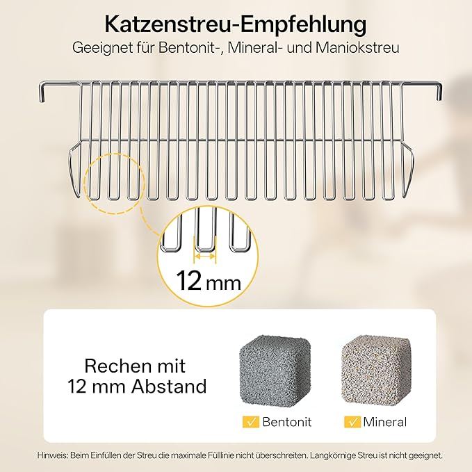 - 🐾 FRESH HOME, HASSLE-FREE: Enjoy a truly odor-free home with our enclosed waste bin and included deodorizer block that locks away and neutralizes smells. The 12mm rake is perfectly compatible with bentonite, silica, and cassava clumping litters, ensuring efficient waste sifting (not for long-strip litters).